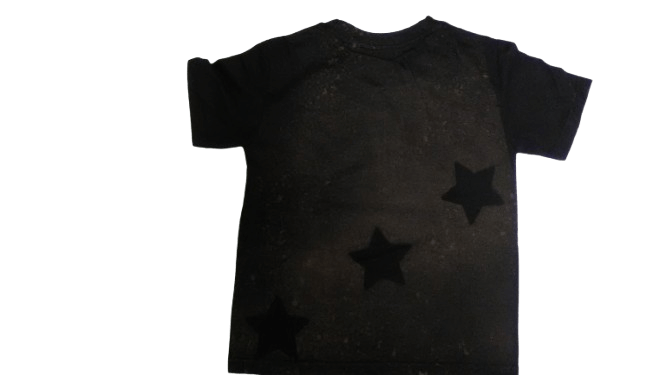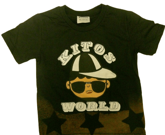 Kids kitos world star t-shirts.  Printed on front is the kitos world with logo.  Followed on the bottom with stars that are sprayed on bottom and the back of the shirt as well.